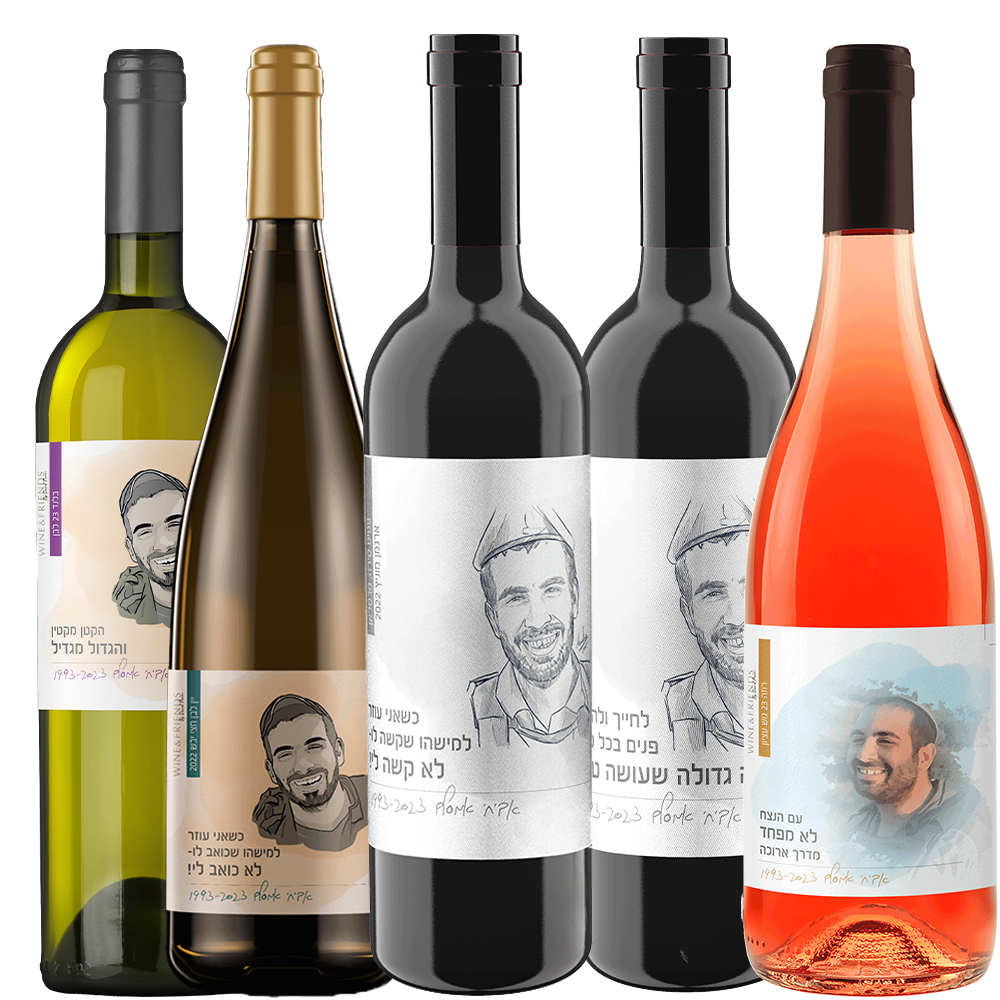 חמישה בקבוקי יין לזכר אביחי אמסלם. בקבוקי יין שונים. שני בלנדים אדומים, שני בלנדים לבנים ואחד רוזה.