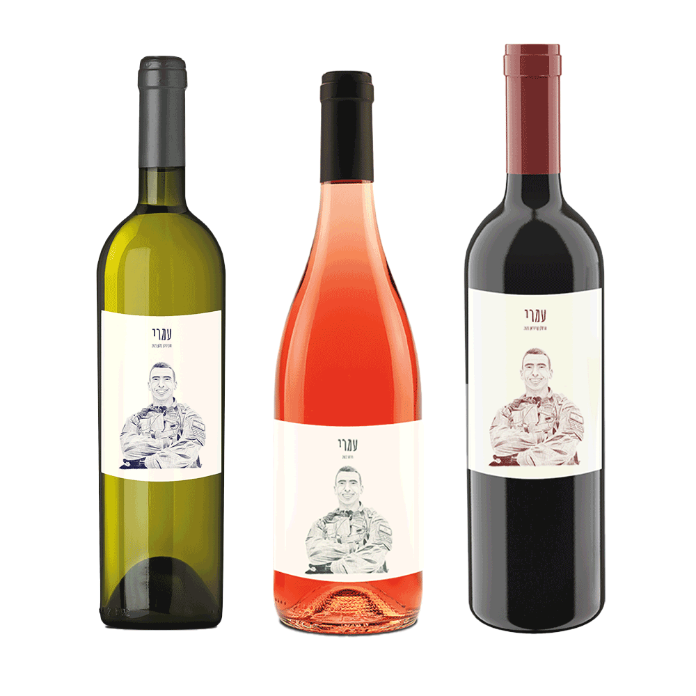 שלושה בקבוקי יין לזכר עמרי בן שחר משלושה יקבים ואזורים שונים, 1 יין אדום, 1 רוזה ואחד יין לבן. כל בקבוק 750 מ"ל.