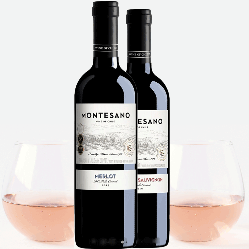 זוג כוסות יין מהודרות + זוג יינות אדומים מונטסאנו, צ'ילה.