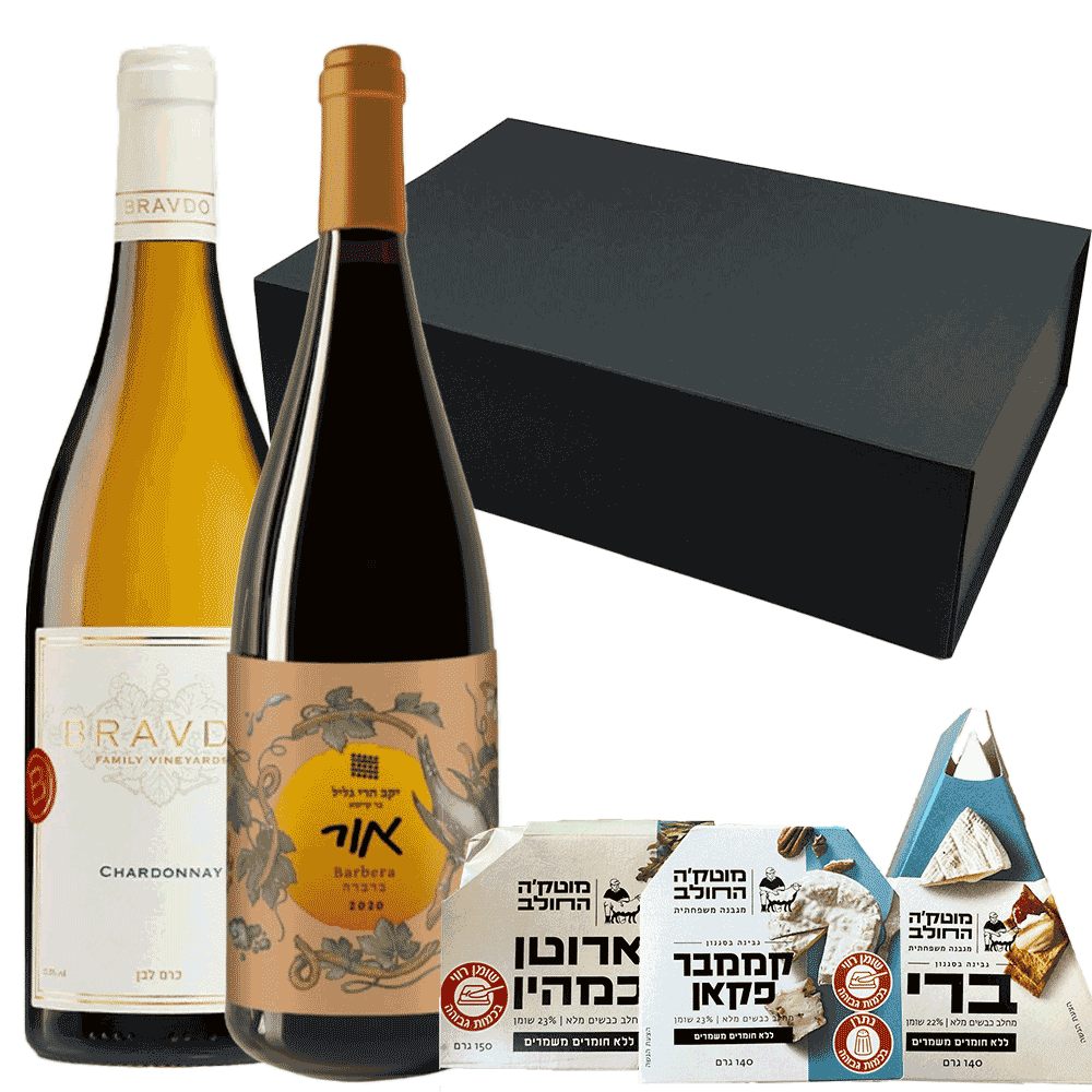 המארז כולל יין אדום, יין לבן ושלוש גבינות של מוטק'ה החולב.