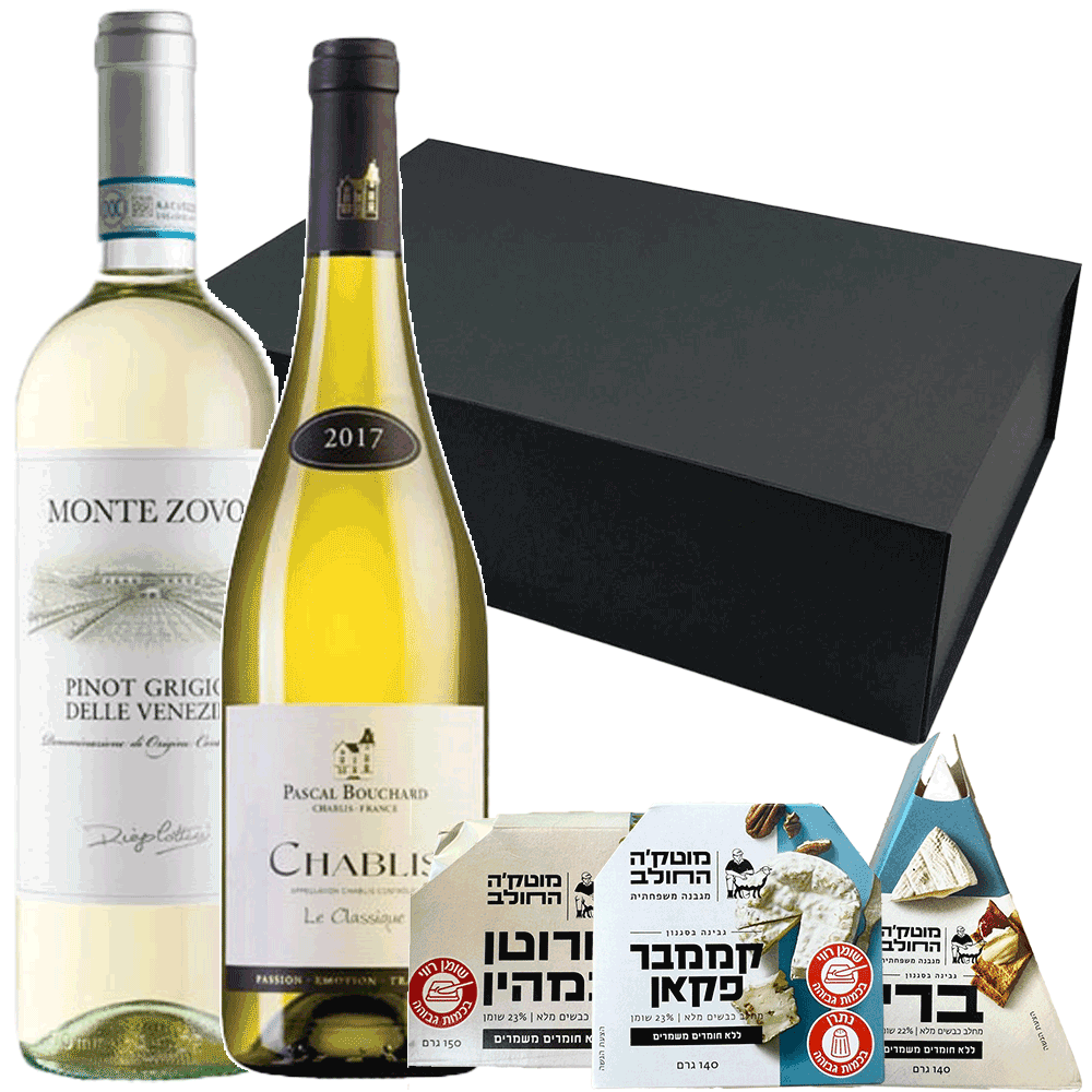 מארז שלוש גבינות וזוג יינות לבנים שיתאימו לשתיה בצד הגבינות.