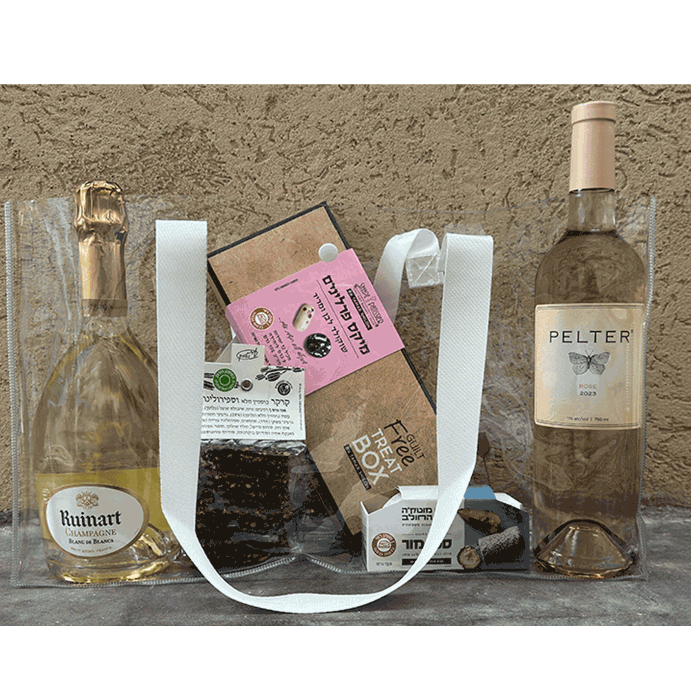 תיק PVC רחב ומיוחד מלא בדברים טובים **תמונה להמחשה בלבד** יינות, גבינות ופיצוחים.
