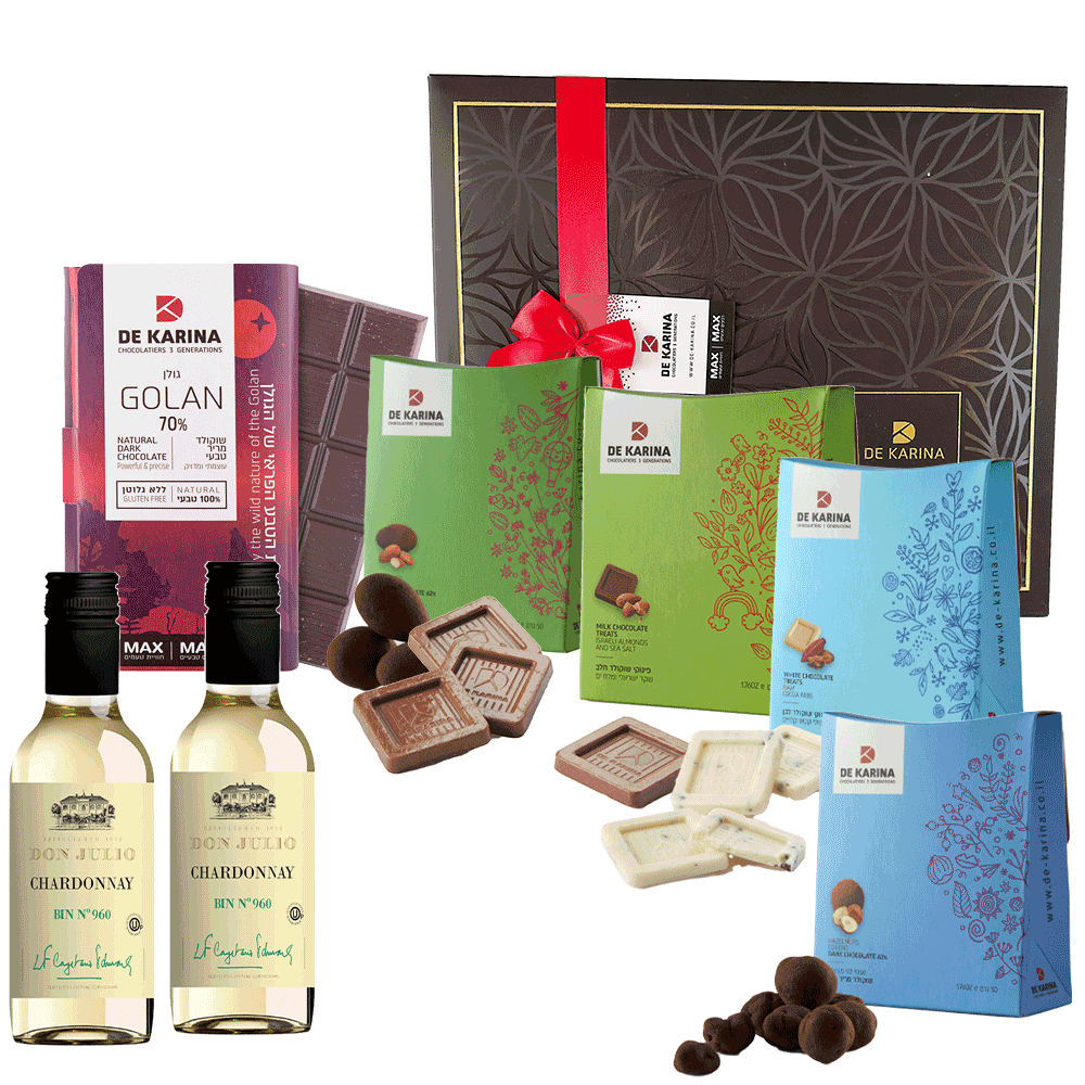מארז המכיל שוקולדים שונים ושני שרדונה קטנים (187 מ"ל כל אחד).
