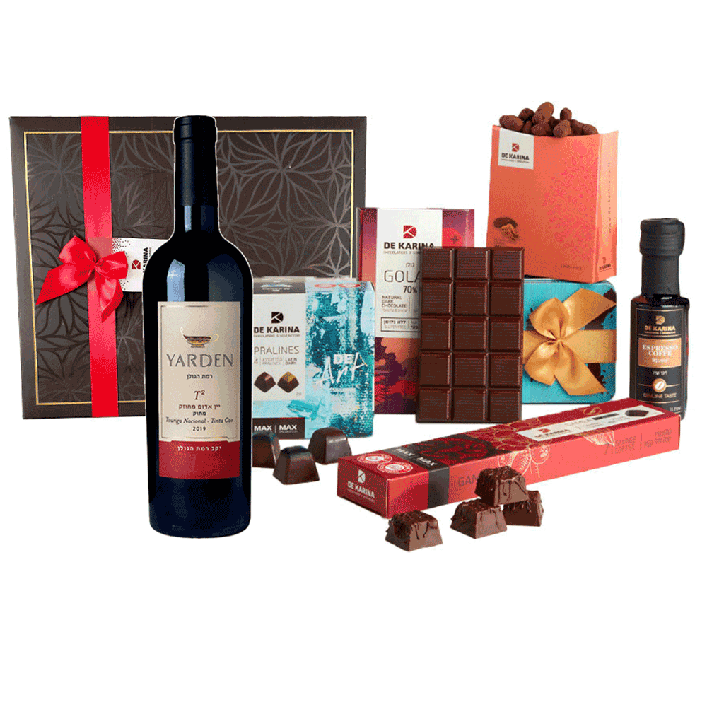 מארז שוקולדים, ליקר שוקולד ויין אדום ירדן מתוק | כשר לפסח. טבעוני