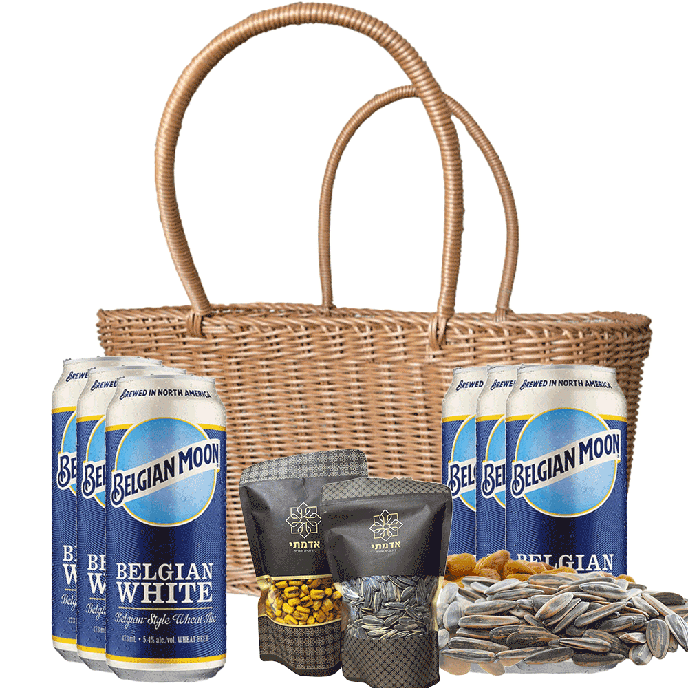 סלסלת קש יפה ועמידה המכילה 6 פחיות בירות חיטה בלומון – בירה בלגית ( 500 מ"ל לכל פחית. 5.4% אלכוהול). בירת חיטה מבושלת עם קליפת תפוז למתיקות עדינה וניחוח הדרים בהיר. הטוויסט קליפת תפוז וכוסברה. המלצת הגשה: לעטר את הכוס בפרוסת תפוז כדי להגביר את ארומה וטעם ההדרים.