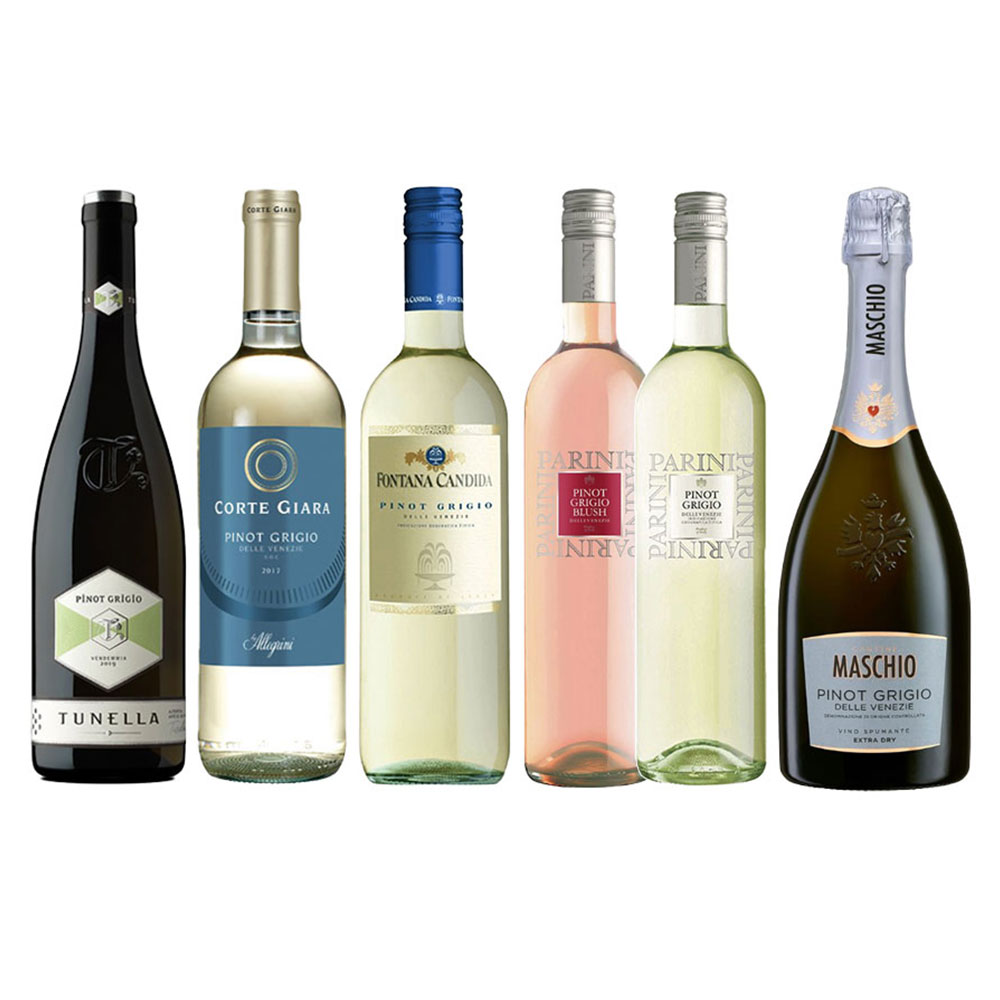 6 יינות פינו גריג'יו שונים ומגוונים. כולם מאיטליה מזן הפינו גריג'יו.