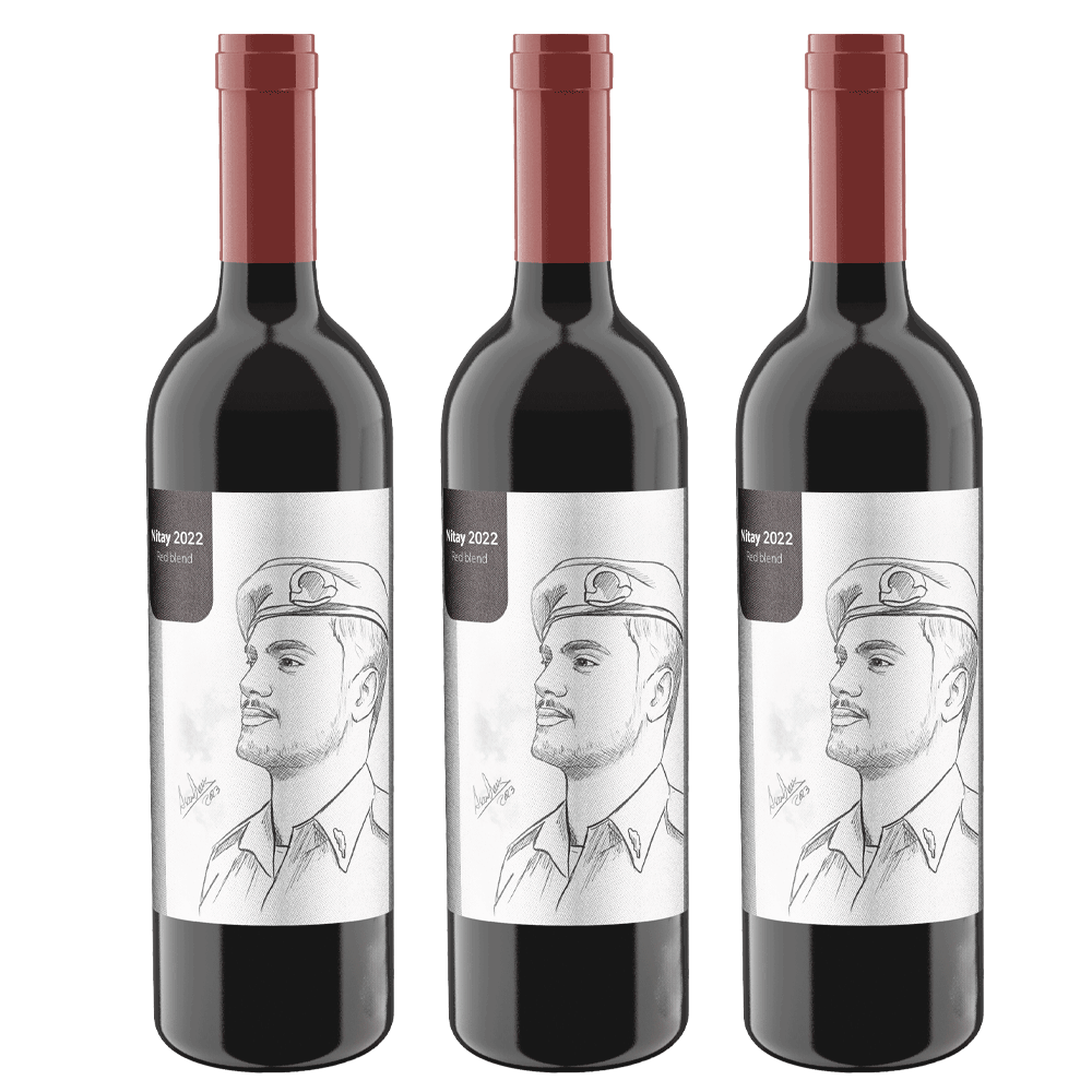 שלושה בקבוקים של יין בלנד אדום ניתאי מבציר 2022 (היתר מכירה) המורכב משילוב של חמישה זני ענבים שונים: ענבי קברנה סוביניון, גרנאש, סירה, מורבדרה ומעט גוורצטרמינר אשר נבצרו מחלקות מובחרות במיוחד להרכבת הבלנד.