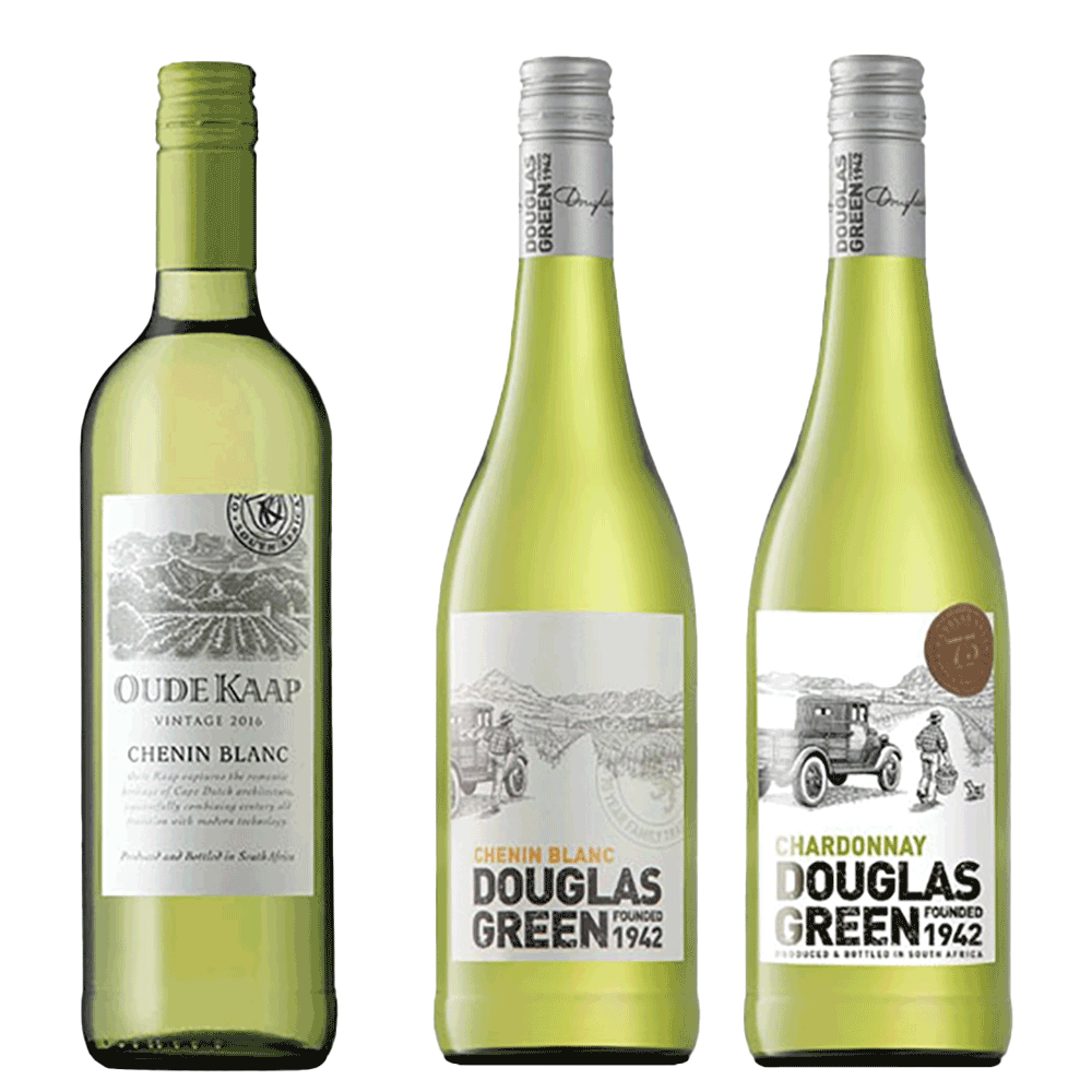 שני בקבוקים שנין בלאן ובקבוק אחד שרדונה מדרום אפריקה |