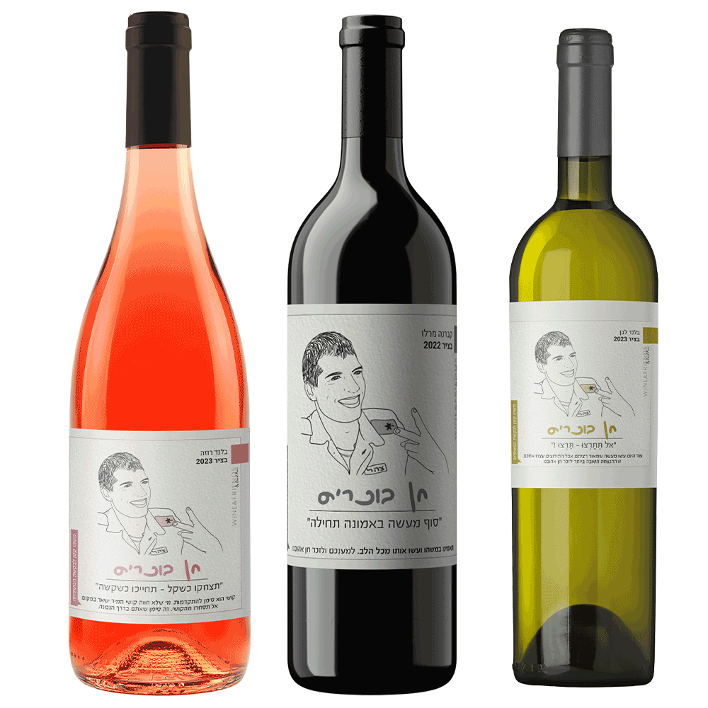 שלושה בקבוקי יין שונים לזכרו של רב סרן חן בוכריס, סגן מפקד יחידת מגלן.