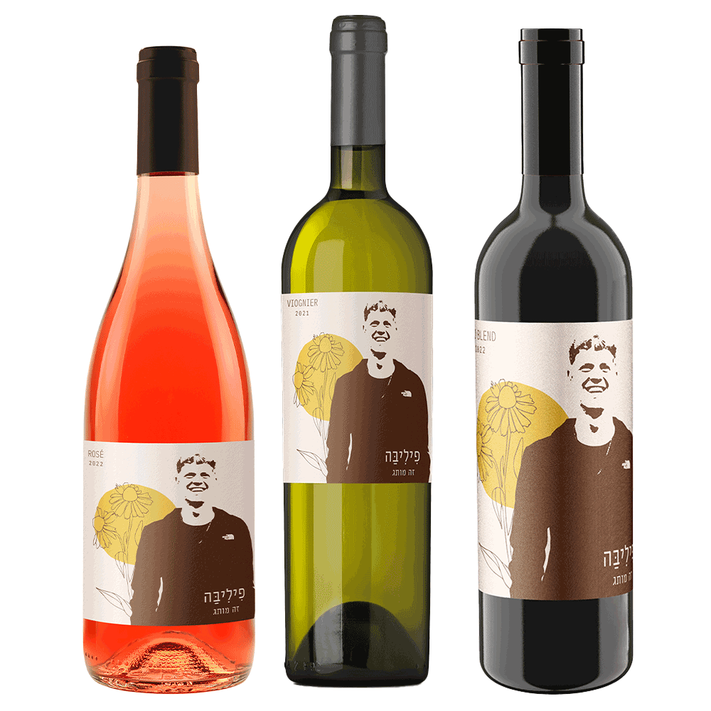 שלושה בקבוקי יין לזכרו של טל פיליבה.יין אדום, לבן ורוזה.
